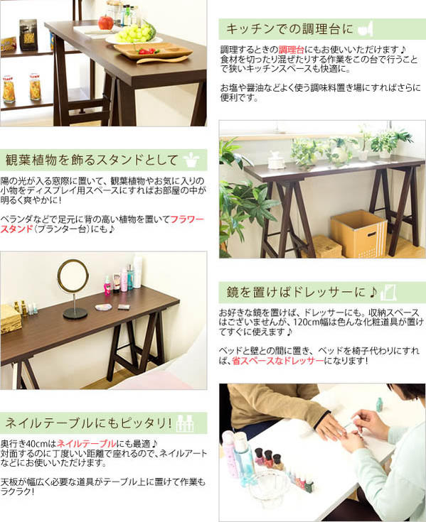 クデスク、カウンターテーブル、ドレッサーなど様々なシーンで使えて、とっても便利なデスク、WOOD PEG(ウッドペッグ)。