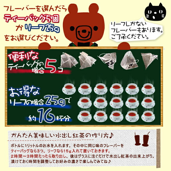 「リーフのみ」のフレーバーを【ティーバッグ】でご希望いただいた場合【リーフ】でお届けさせて頂きますので、予めご了承ください。