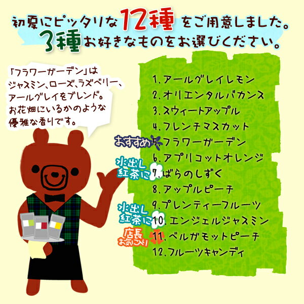 ITEM INFORMATION - アイテムインフォメーション 商品名 ≪季節の紅茶福袋≫ 12種の中から選べる3種 内容量 (12種から3種ご選択) リーフティー25g/ティーバッグ5個入 送料 メール便送料無料 (メール便は一部お送りできない地域がございます。