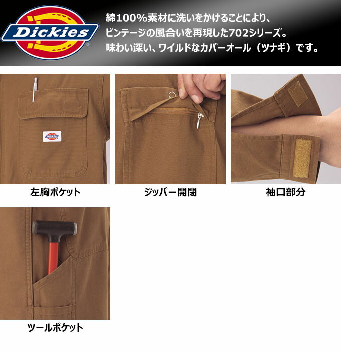 ディッキーズ/Dickies 702 ワイルド・カバーオール 綿100%素材に洗いをかけることにより、ビンテージの風合いを再現した702シリーズ。